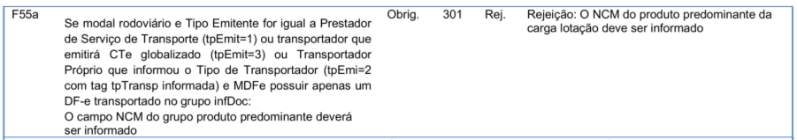 Ao tentar transmitir um MDF-e para a SEFAZ, retornou a rejeição “301 – Rejeição: O NCM do produto predominante da carga lotação deve ser informado“.